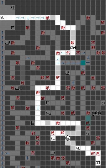 ここでは最短ルートのみを示しますが、ルートの付近にある燃料は、一方通行で隔てられてない限りは、できるだけ取ってください。でないと、燃料が必ず尽きます。 エレベーターは4基ありますが、1、4、3の順番に乗り継ぐ必要があります。2基目はクリアに関係ないようです。 燃料屋さんがないかわりに、燃料は比較的豊富に落ちています。ただし、重力波砲#2の燃料消費量が激しいので、攻略に必要ない場所に入ってしまうとすぐに尽きてしまいます。 ゲートLを開放したら、通れる壁の先にある柱(空調装置?)を動かして、ゲートLの先にあるエレベーターで上の階に行ってください。 途中、COM印の所でコンピューターが「爆発の振動を感知しました。私達以外にもこの船を破壊している者がいるようです」と言います。しかし、この時点ではマップ上に特に変化はありません。 |