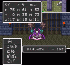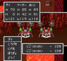 こいつがイオナズンを使うので、まず1ターン目でアーサーのマホトーンは必須です。でないと、1ターンで全滅させられる可能性もあります。また、攻撃力もものすごく強いので、2ターン目からアーサーはベホマ専門にしておき、まいこの「ルカナン」「マヌーサ」と、ダイの物理攻撃で攻めましょう。ラリホーは効かなかったと思います。