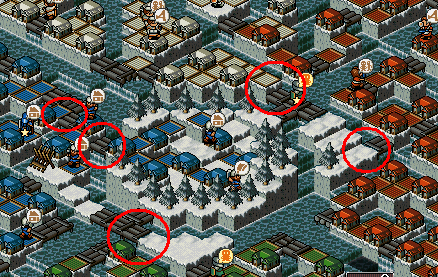 赤軍に入って来られないように柵を作って阻止します。しかし、このままだと赤軍がどんどんたまってしまうので、時計のちょっと下に橋をかけて赤軍と青軍を戦わせるようにします。また、自軍の下の橋には柵をつくっておいて味方のオートの兵士が勝手に下に行かないようにします。