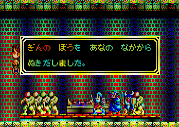 ちなみに、途中セーブのできないPC-8801版でも、特別にここだけはセーブができるようになっています。思えば、当時はPC-8801でよくここまでクリアしたよなぁ。PC-8801版では「セーブしますか?y/n」と表示され、nを押すと「それとも、このまま戦いを挑みますか?」と表示されます。PC-9801版では、[F2]でセーブができるので、そのようなメッセージは出ません。