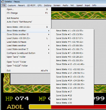 なので、竹トンボでHPを大量に奪われた時は、あきらめてやり直したいのですが、いざ自殺しようと思っても、そういう時に限ってアレム様の攻撃がショボくなってなかなか死ねません。仕方がないので、[X]でエミュレーターを閉じた後、再起動すると・・・。
