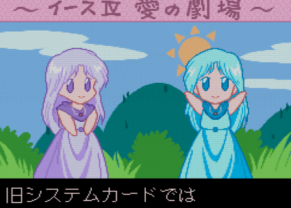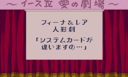 Ver3.0未満のシステムカード(スーパーじゃないシステムカード)で起動させると、イースIV 愛の劇場 フィーナ&レア人形劇 「システムカードが違いますの・・・」が表示されます。